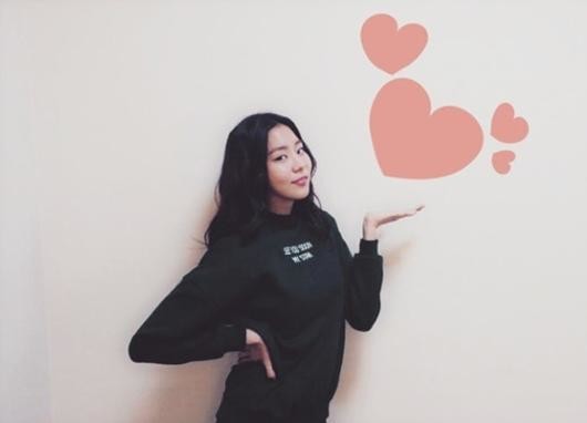 공개된 사진 속 유이는 하트 모양의 그림을 손으로 들고 있는 듯한 포즈를 지으며 애교 있는 표정으로 카메라를 응시하고 있다.