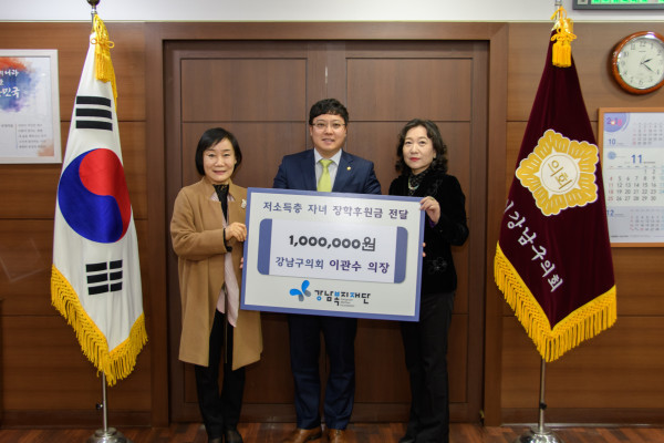 이관수 서울 강남구의회 의장이 28일 강남복지재단 관계자들을 초청, 저소득층 자녀 장학후원금으로 100만원을 기부하고, 강남복지재단 이사진과 간담회를 진행했다. 사진은 이 의장(가운데)가 강남복지재단에 저소득층 자녀 장학금을 전달하고 기념촬영을 하고 있는 모습. (사진제공=강남구의회)