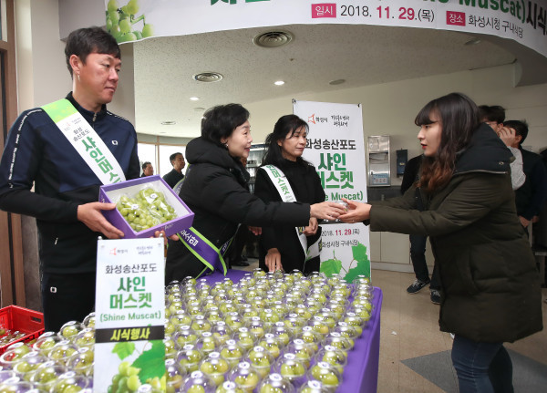 경기 화성시가 일반 캠벨포도에 비해 약 6배나 비싸게 판매되는 껍질째 먹는 ‘샤인머스켓’ 생산 확대에 나섰다. 사진은 ‘샤인머스켓’을 생산하는 젊은 농부들이 29일 시청 구내식당에서 시식회를 열고 소비자 반응을 살피고 있다. (사진제공=화성시청)