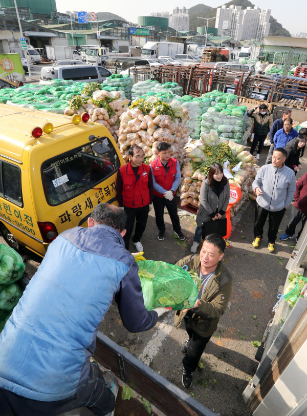 29일 부산 해운대구 반여농산물도매시장 채소동 앞에서 사회복지관 직원들이 김장배추를 차량에 옮겨 싣고 있다. 반여농산물도매시장관리사업소와 농협반여공판장 상인들은 해운대지역 불우이웃과 복지시설에 김장배추 9000여 포기를 지원하는 '사랑의 김장배추 나눔' 행사를 마련했다.