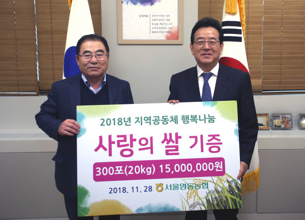 정순균 서울 강남구청장이 28일 구청 제1작은회의실에서 열린 ‘사랑의 쌀 전달식’에서 서울영동농협으로부터 지역내 어려운 이웃에게 기부할 쌀 20kg·300포(1500만원 상당)를 전달받았다. 사진은 정 구청장(오른쪽)이 영동농협 관계자와 기념촬영을 하는 모습. (사진제공=강남구청)