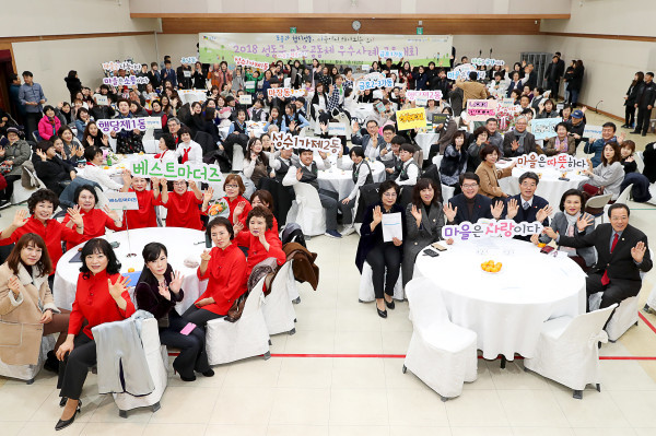 성동구는 최근 주민 160여명이 모인 가운데, 2018년 지역내 주민활동을 결산하고 끈끈한 네트워크의 마을공동체로 거듭나기 위해 ‘마을공동체 우수사례 공유대회’를 구청 3층 대강당에서 개최했다. 사진은 대강당에 모인 정원오 구청장 및 주민들의 모습. (사진제공=성동구청)