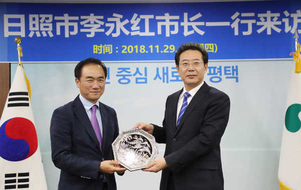 리융흉 중국 일조시장이 최근 우호교류도시인 경기 평택시를 방문했다. 리융훙 일조시장은 첫 해외방문일정으로 시를 방문해 향후 우호교류 활성화 및 협력관계 구축 의지를 다졌다. 사진은 정장선 평택시장과 리융훙 일조시장이 기념촬영한 모습. (사진제공=평택시청)