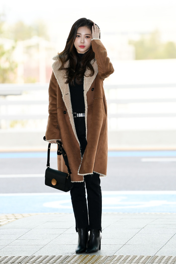 이날 유라는 무스탕과 함께 블랙 컬러의 이너와 팬츠로 깔끔한 스타일을 선보였다. 여기에 서큘러 버클 디테일이 돋보이는 미니 크로스바디 백과 청키한 블록 힐 부츠를 매치해 편안하면서 매력적인 스타일링을 완성했다.