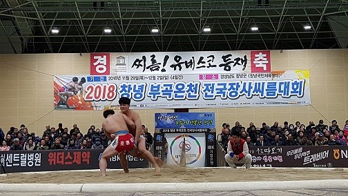 | ▲ 사진설명: 2018 창녕 부곡온천 전국장사씨름대회 대학부 결승전 장면 | ||
