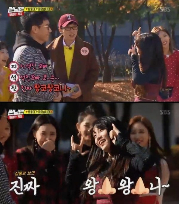 모모는 지석진을 바라보며 ‘지석진’으로 삼행시를 했다. 유재석이 ‘지’를 외치자 모모는 “지석진 오빠”, ‘석’에는 “석지오빠 코는”, ‘진’에는 “진짜 왕코왕코니”라고 했다.