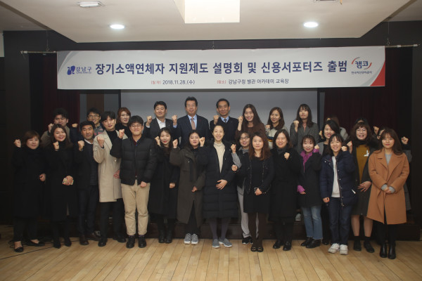 | ▲ 지난 11월28일 진행된 '신용서포터즈' 출범식에서 신용서포터즈들이 포즈를 취하며 기념촬영을 하고 있다. (사진제공=강남구청) | ||