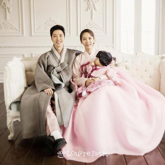 공개된 사진 속에는 한복을 곱게 차려 입은 이동건과 조윤희, 그리고 딸 로아가 다정하게 미소를 지으며 포즈를 취하고 있는 모습이 담겨 있다.