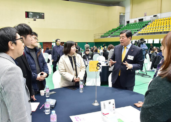 경기 안산시는 3일 시민들과의 소통·공감을 통한 인구·청년 정책 발굴을 위해 올림픽기념관(체육관)에서 '안산시민 200인 원탁토론회'를 개최했다. 사진은 윤화섭 시장이 참여자들과 이야기를 나누는 모습. (사진제공=안산시청)