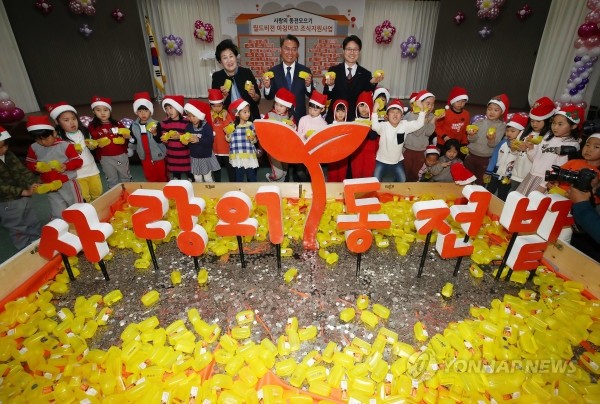 4일 오전 서울 광진구청에서 열린 '사랑의 동전모으기' 행사에서 김선갑 광진구청장과 인근 국공립 어린이집 어린이들이 직접 모은 동전 앞에서 기념촬영을 하고 있다.