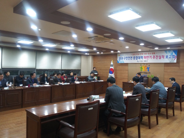 수원시 영통구는 3일 구청 상황실에서 ‘2018 구민안전 종합대책 하반기 추진실적 보고회’를 개최했다. 이날 보고회는 구민안전대책을 추진 중인 9개부서 과장 및 17개 팀장이 참석해 2018년 구민안전 종합대책 19가지 추진과제에 대한 추진실적과 향후계획을 보고했다. 사진은 박래헌 구청장 및 참여자들이 이야기를 나누는 모습. (사진제공=수원시청)