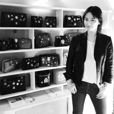 올라온 사진 속 송혜교는 가죽 잠바를 입고 가방 앞에서 사진을 찍고 있다.