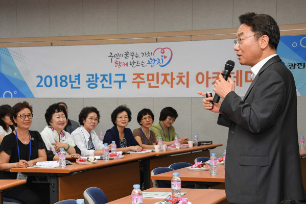 | ▲ ‘2018년 광진구 주민자치아카데미’에서 김 구청장이 강의하고 있다. | ||
