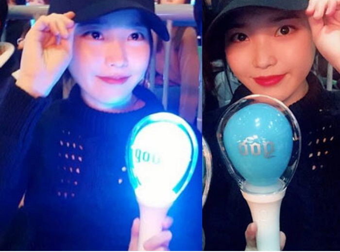 아이유는 god 응원봉을 손에 든 채 검은색 모자로 얼굴을 가리고 있었지만 현장에 있던 팬들에게 금세 탄로 났다.
