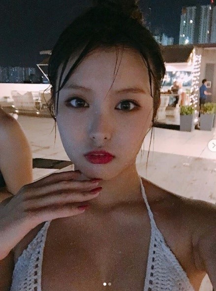 공개된 사진 속 아인은 수영장을 배경으로 셀카를 찍고 있는 모습이다. 아인은 하얀색 비키니를 입고 있는데, 은근하게 드러나는 볼륨감이 섹시한 분위기를 자아낸다.