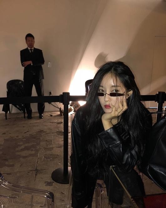 게재된 사진 속 효민은 까만색 가죽 재킷에 독특한 디자인의 선글라스를 착용했다. 여기에 액세서리로 포인트를 더한 효민은 시크한 표정으로 카리스마를 자아냈다.