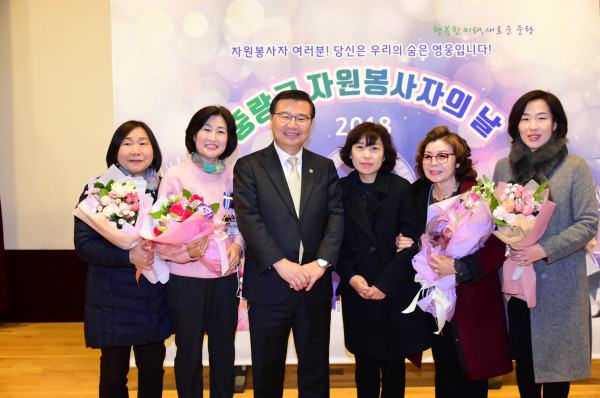 서울 중랑구는 지난 4일 구청 대강당에서 자원봉사자, 자원봉사단체, 구민 등 400여명이 참여한 가운데 ‘2018 중랑구 자원봉사자의 날 기념식’을 개최했다. 사진은 류경기 구청장(왼쪽에서 세 번째) 및 우수 봉사자들이 기념촬영을 하는 모습. (사진제공=중랑구청)