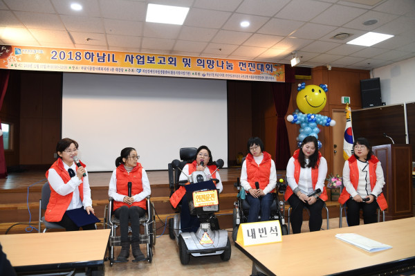 경기 하남장애인자립생활센터는 5일 하남시종합사회복지관에서 '2018년 사업보고회 및 희망 나눔 전진대회'를 개최했다. 이번 행사는 한 해 동안 진행한 사업에 대한 보고와 장애인의 자립을 위해 힘쓴 유공자들의 표창을 수여하고, 전동휠체어 배터리 전달식 등으로 진행됐다. 사진은 참여자들이 이야기를 나누는 모습. (사진제공=하남시청)