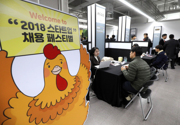 강남구 역삼동 팁스타운에서 굿게임즈, 우아한형제들, 바로고 등 49개 스타트업 업체가 참여한 ‘2018 스타트업 채용 페스티벌’이 개최됐다. 이날 페스티벌에서는 200여명 규모의 채용 면접과 채용부스, 채용설명회 등이 진행됐다. 사진은 채용부스에서 취업준비생들이 상담을 받고 있는 모습. (사진제공=강남구청)