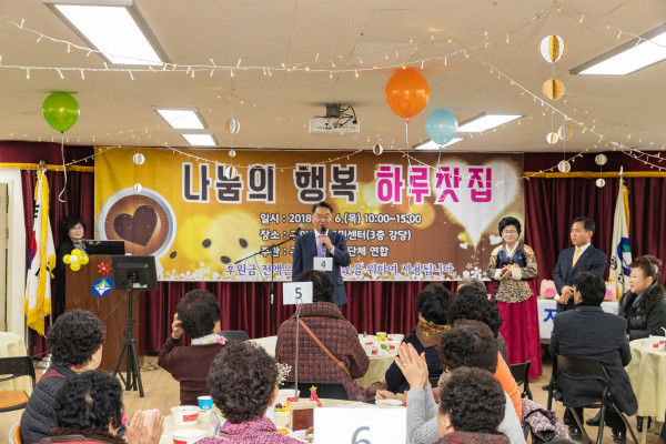 서울 광진구 구의2동 직능단체 연합회는 지난 6일 구의2동 주민센터 3층 강당에서 각 직능단체 회원들과 주민 등 300여명이 참석한 가운데 ‘나눔의 행복, 하루 찻집’을 개최했다. 사진은 행사에 참여한 김선갑 구청장이 인사말을 하는 모습. (사진제공=광진구청)
