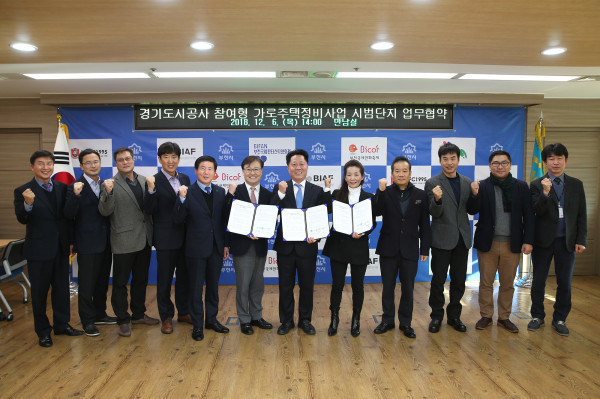 경기 부천시가 최근 역곡동 104번지 일원 노후주택인 대림아파트를 참여형 가로주택정비사업 시범단지로 선정하고 대림아파트 조합 및 경기도시공사와 업무협약을 체결했다. 사진은 협약 후 기념촬영을 하고 있는 관계자들의 모습. (사진제공=부천시청)