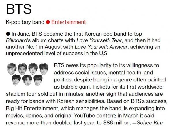 블룸버그는 방탄소년단을 뽑은 이유에 대해 “방탄소년단은 지난 6월 LOVE YOURSELF 轉 ‘Tear’로 빌보드 앨범 차트 1위에 오른 첫 케이팝 밴드이며, 8월 LOVE YOURSELF 結 ‘Answer’로 다시 한 번 차트 1위를 차지해 미국에서 전례 없는 수준의 성공을 거뒀다”고 설명했다.