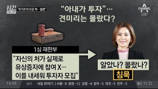 이어 "(견미리가) 남편이 주가조작을 하는 건 몰랐을 것이다. 공모를 하지 않았고 방조한 것이 아니기 때문에 견미리 씨에게 법적 책임은 없다"고 설명했다.