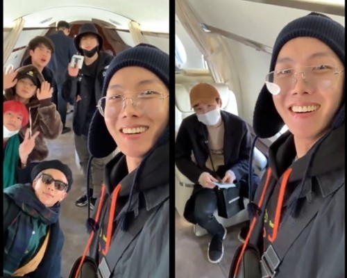 공개된 영상에는 방탄소년단 멤버들이 전용기 안에서 카메라를 향해 포즈를 취하고 있다.