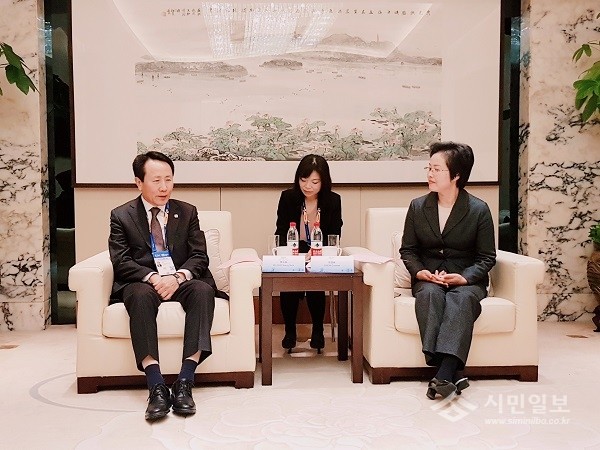| ▲ 조영택 2019 광주세계수영선수권대회 조직위원회 사무총장(사진 왼쪽)은 8일 오전 항저우 인터콘티넨탈 호텔에서 천 궈메이(Chen Guomei) 항저우시 부시장 겸 제14회 FINA 25m 쇼트코스 세계수영선수권대회 조직위원회 사무총장과 면담을 갖고 적극적인 지원과 협조를 당부했다. 사진-광주세계수영선수권대회 조직위 제공 | ||