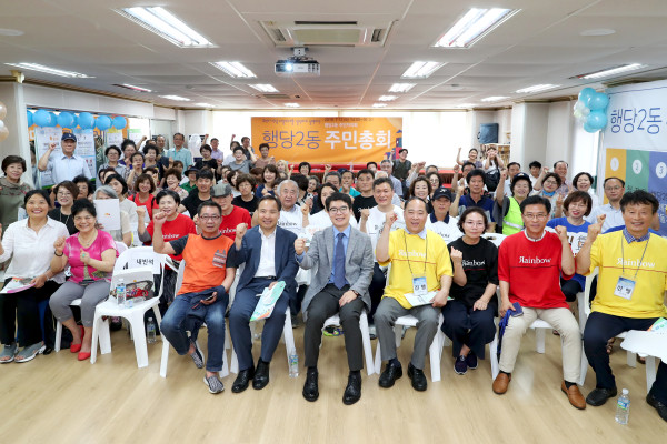 | ▲ 행당2동 주민총회에 참여한 정원오 구청장(앞줄 오른쪽에서 네번째)이 주민들과 기념촬영한 모습. (사진제공=성동구청) | ||