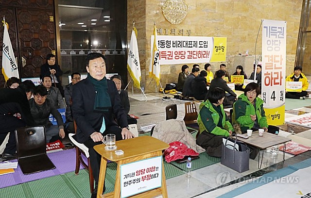 바른미래당 손학규 대표, 정의당 이정미 대표와 야3당 의원, 당직자들의 연동형 비례대표제 도입 촉구 단식과 농성이 9일 오전 국회 본청 로텐더홀에서 이어지고 있다.
