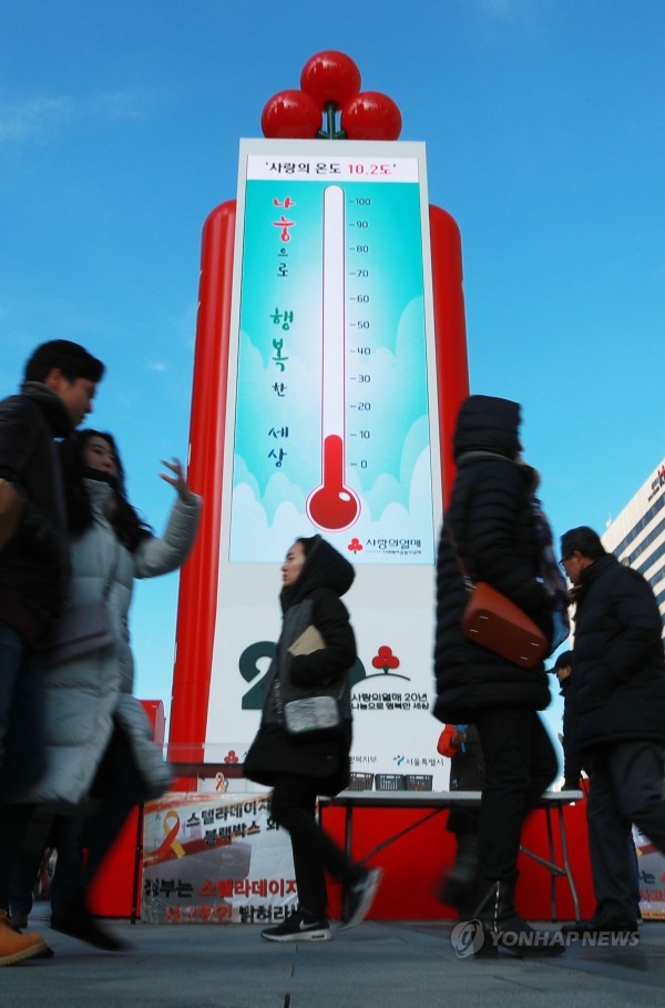 9일 서울 종로구 광화문 광장에 설치된 사회복지공동모금회의 '사랑의 온도탑'이 10.2도를 가리키고 있다.