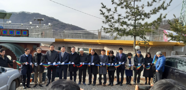 경기 양주시 백석읍 소재 기산리마을회는 최근 정성호 국회의원, 이채용 노인회 지회장, 이정주 백석읍장, 김승원 이통장연합회장 등 내빈이 참석한 가운데 마을회관 및 경로당 개관식을 개최했다. 사진은 참여자들이 테이프 커팅을 하고 있는 모습. (사진제공=양주시청)