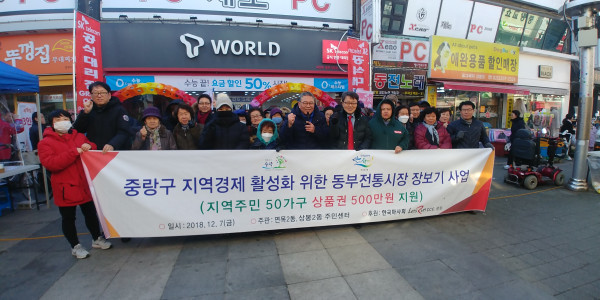 한국마사회 중랑문화공감센터가 지난 7일 중랑구 면목동에 소재한 동부시장에서 전통시장 활성화 및 취약계층 지원을 위한 ‘전통시장 장보기 사업’에 상품권 500만원을 지원했다. 사진은 관계자들이 기념촬영을 하는 모습. (사진제공=중랑구청)
