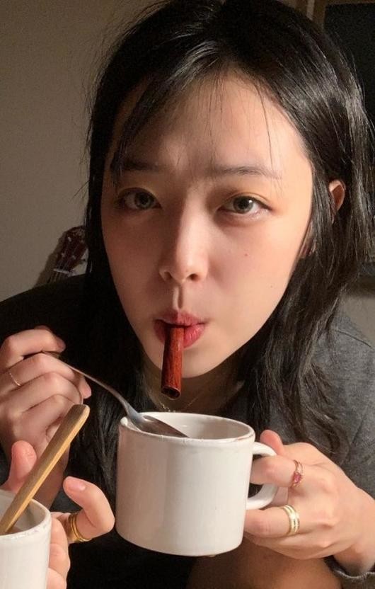 공개된 사진 속 설리는 지인과 함께 차를 마시며 셀카를 남기고 있는 모습. 설리는 계피를 입에 물고 귀요미 표정을 지어 팬들을 설레게 만들었다.