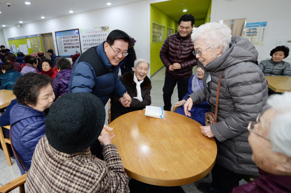 | ▲ 한 경로당을 방문한 유덕열 구청장이 추운 겨울 경로당에서 몸을 녹이고 있는 노인들과 인사를 나누고 있다. (사진제공=동대문구청) | ||