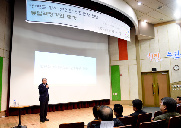 서울 노원구는 통일부장관을 지낸 이종석 세종연구소 통일전략연구실 수석연구위원을 초청해 지난 7일 구청 6층 소강당에서 ‘한반도 정세 변화와 평화번영 전망’을 주제로 특강을 실시했다. 사진은 이종석 전 장관이 강의를 진행하는 모습. (사진제공=노원구청)