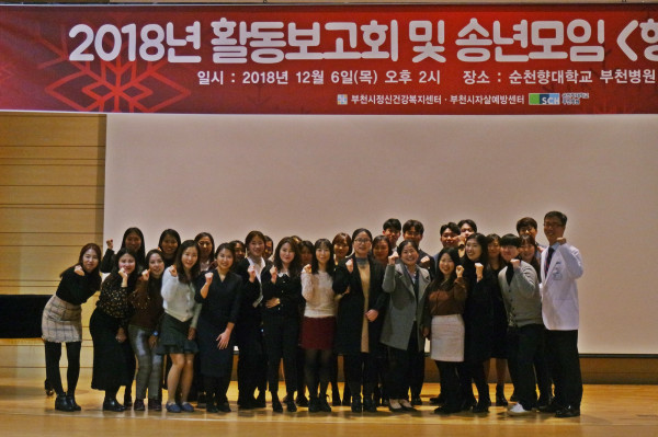 경기 부천시보건소와 부천시정신건강복지센터는 최근 순천향대학교 부천병원 향설대강당에서 만성정신장애인과 가족 등 230여명이 참석한 가운데 2018년 활동보고회 및 송년모임 ‘행복한 동행’을 개최했다. 사진은 참가자들이 기념촬영을 하는 모습. (사진제공=부천시청)