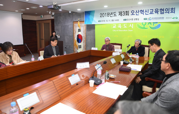 경기 오산시는 화성오산교육지원청과 11일 시청 상황실에서 ‘2018년 제3회 오산혁신교육협의회’를 열었다. 협의회는 공동위원장인 곽상욱 오산시장과 방용호 화성오산교육지원청 교육장을 비롯해 시청, 시의회, 교육지원청, 학교 관계자와 학부모 등 총 13명으로 구성됐다. 사진은 참여자들이 회의하는 모습. (사진제공=오산시청)
