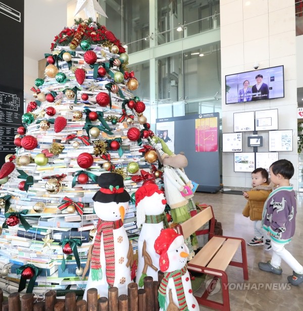'성탄절'을 앞둔 12일 세종시 국립세종도서관 로비에 1000여권의 책으로 만든 '책 트리'가 설치돼 도서관을 찾은 사람들의 시선을 끌고 있다.