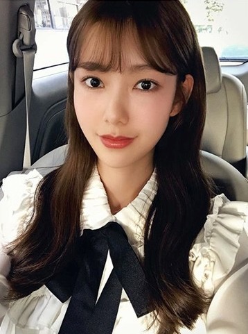 이 사진은 차량 안에서 촬영된 것이다. 검정색 리본이 달린 하얀색 블라우스 차림이다. 굵은 웨이브의 긴 머리를 늘어뜨리고 카메라를 향해 미소를 살짝 보이고 있다.