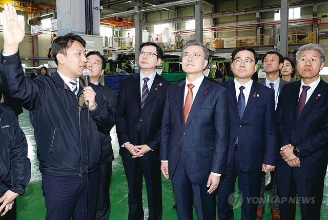 문재인 대통령이 13일 오전 경남 창원에 위치한 스마트 제조혁신 중소기업인 삼천산업을 방문해 제품 생산 공정을 지켜보고 있다.