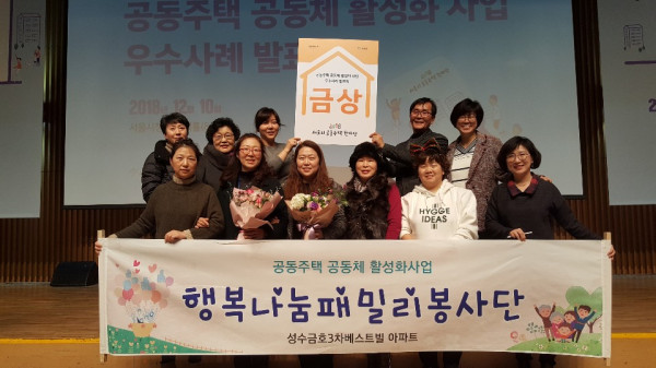 성동구가 ‘2018 서울시 공동주택 공동체 활성화사업 우수사례 발표회’에서 수상의 영예를 안았다. 금상에 성수금호3차아파트가 선정됐으며, 우수모범관리단지에 텐즈힐1단지가 선정됐다. 사진은 금호3차아파트 관계자들이 기념촬영을 하는 모습. (사진제공=성동구청)