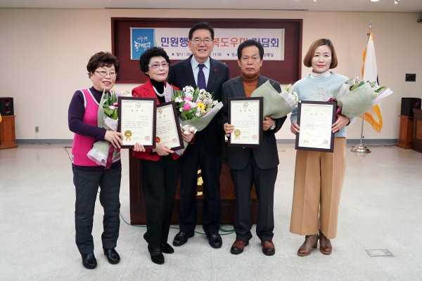 최근 서울 동대문구 ‘민원행정 행복도우미’의 노고를 위로하기 위한 간담회를 열고, 더 나은 행정서비스 제공을 위한 의견을 나누고, 우수 행복도우미 4명에게는 표창을 수여했다. 사진은 표창 수여 후 기념촬영을 하고 있는 모습. (사진제공=동대문구청)