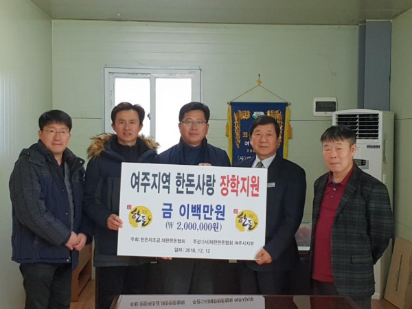 경기 여주시 대한한돈협회는 최근 드림스타트에 장학금 200만원과 귤 10박스를 전달했다. 이날 기탁받은 장학금과 귤 10박스는 장학지원이 필요한 아동 10명에 전달될 예정이다. 사진은 기탁을 기념해 기념촬영을 하는 모습. (사진제공=여주시청)