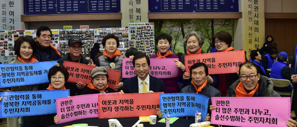 서울 서대문구 천연동·연희동·홍제1동·남가좌1동·북가좌1동 주민자치회 연합 출범식이 13일 오후 서대문구청 대강당에서 열린 가운데 문석진 구청장(가운데)과 자치회 위원들이 행복한 지역 공동체를 염원하는 내용이 담긴 손팻말을 들어 보이고 있다. (사진제공=서대문구청)