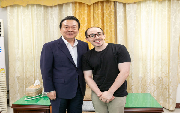 서울 강서구는 최근 구민회관에서 방송인 타일러를 초청해 강서지식비타민 강좌를 진행했다. 이날 강사로 나선 타일러는 한국에 살면서 느끼는 점 등을 토대로 다양성에 대해 강의했다. 사진은 노현송 구청장(왼쪽)과 타일러가 기념촬영을 하는 모습. (사진제공=강서구청)